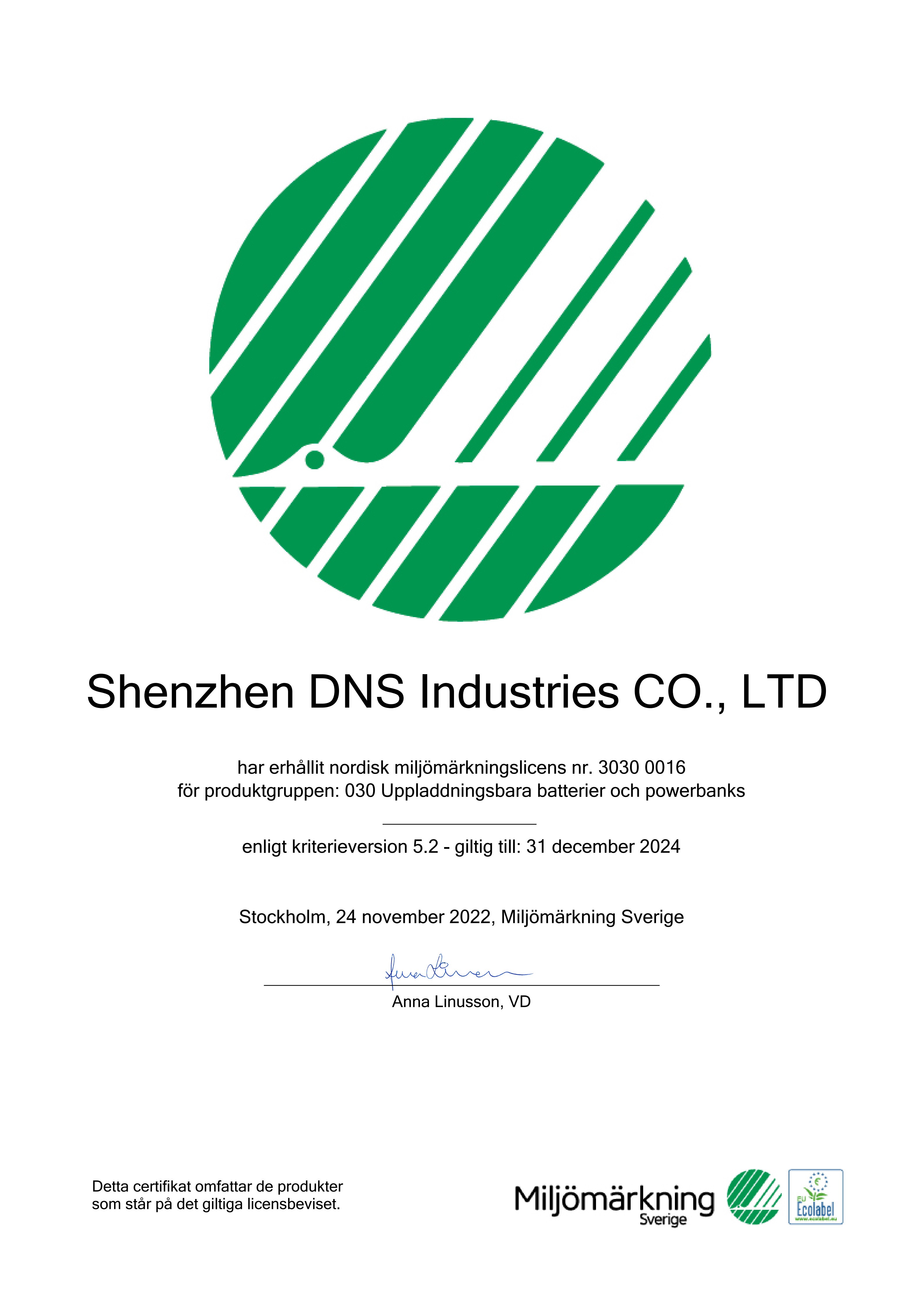 (DNS所获北欧白天鹅生态标签认证证书)